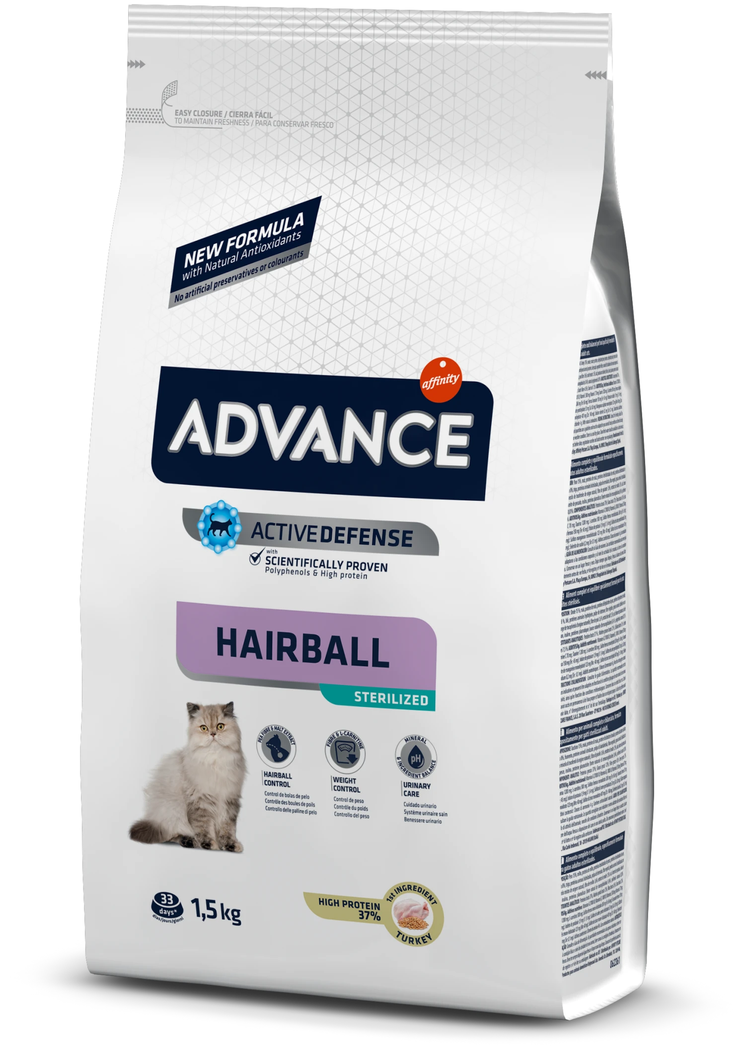 Características de Advance Sterilized HairballPrevención de obesidad: su fórmula favorece el control de las calorías ingeridasProblemas urinarios: controla la formación de cálculos en la orinaBolas de pelo: disminuye su formación con fibra de avena y extracto de malta