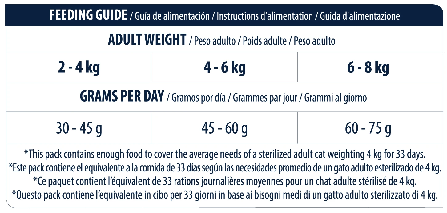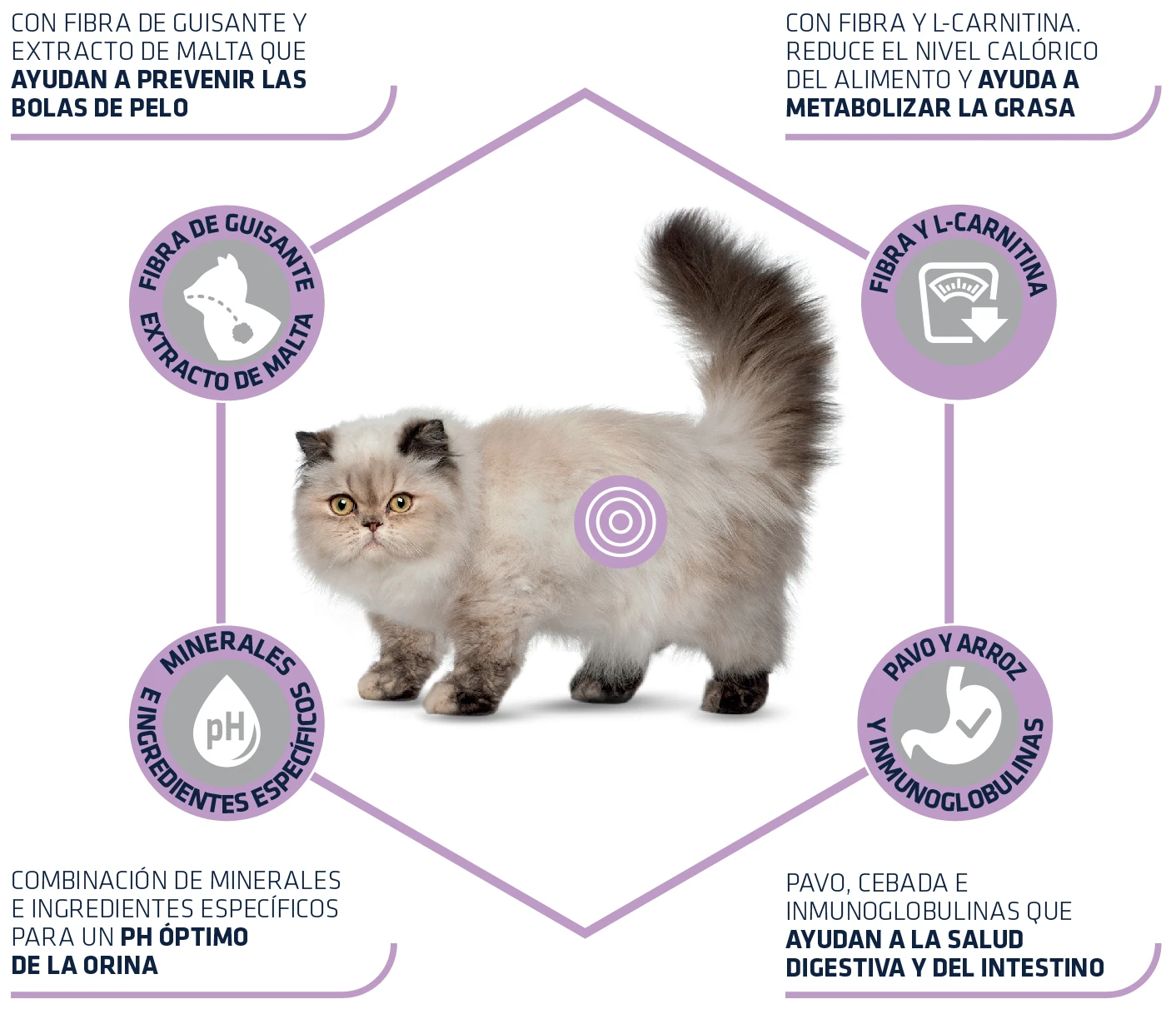 Alimento premium para gatos esterilizados con problemas de formación de bolas de pelo. Es un pienso para gatos que ayuda a mantener un peso adecuado a la vez que facilita la eliminación de bolas de pelo. También cuida la salud urinaria del gato. Disponible en 1.5 kg y 10 kg.