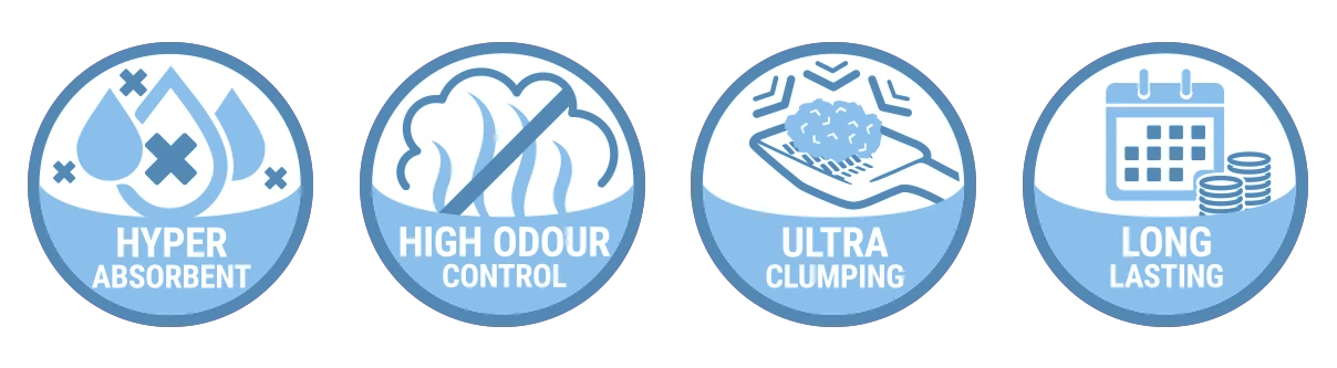 Está hecha de Bentonita Natural con una alta capacidad de absorción, la arena es capaz de absorber hasta un 30% de líquido, esto significa que 100 gramos de arena pueden absorber 300 gramos de líquido. También tiene un alto poder aglutinante y por lo tanto es fácil de limpiar.