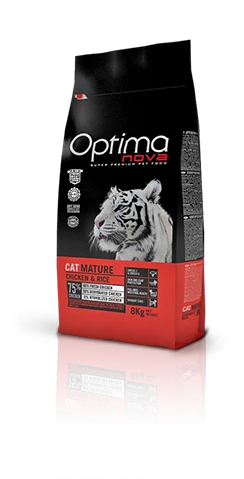 Los gatos mayores tienen un ritmo de actividad diferente, por eso necesitan una alimentación que cuide de ellos, manteniéndolos sanos y fuertes. Optimanova Cat Mature Chicken & Rice es el alimento ideal para gatos de más de 7 años, porque su excelente combinación de minerales protege su piel, su pelo y ayuda a prevenir la formación de cálculos y otras enfermedades del tracto urinario.
