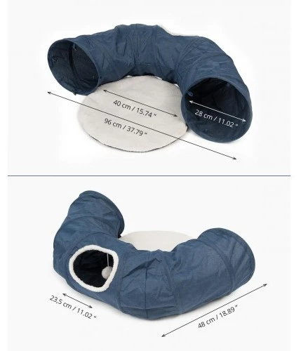 El túnel más cómodo nunca visto. Para jugar y para descansar gracias a su cama de 40 cm de diámetro. El túnel está hecho de tela de alta calidad, que resiste los arañazos de las uñas de los gatos y no atrae sus pelos. El túnel está abierto por ambos extremos y tiene una abertura lateral acolchada para que el gato pueda entrar y salir sin hacerse daño.