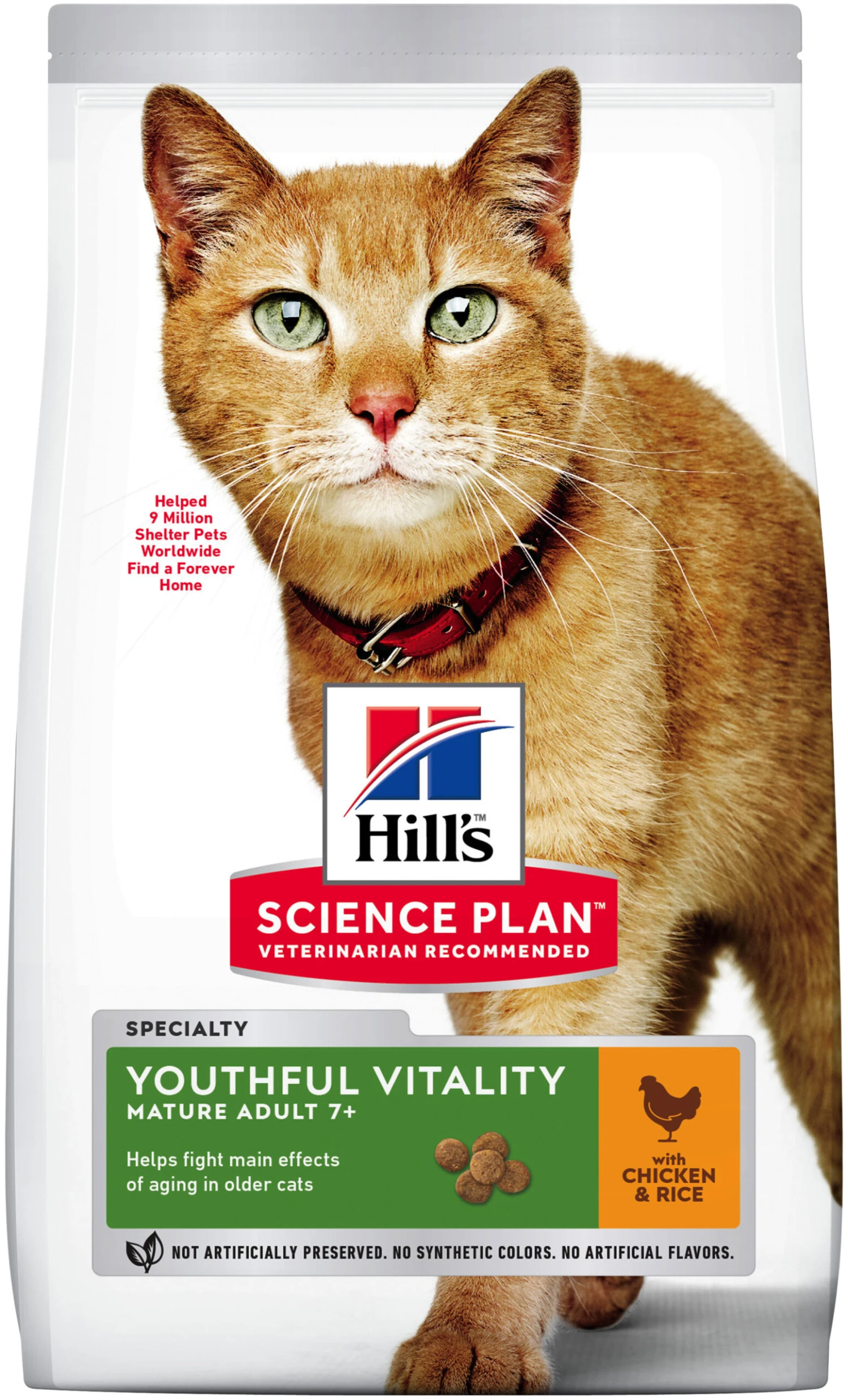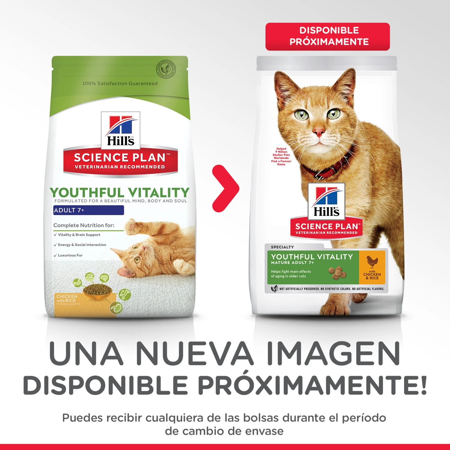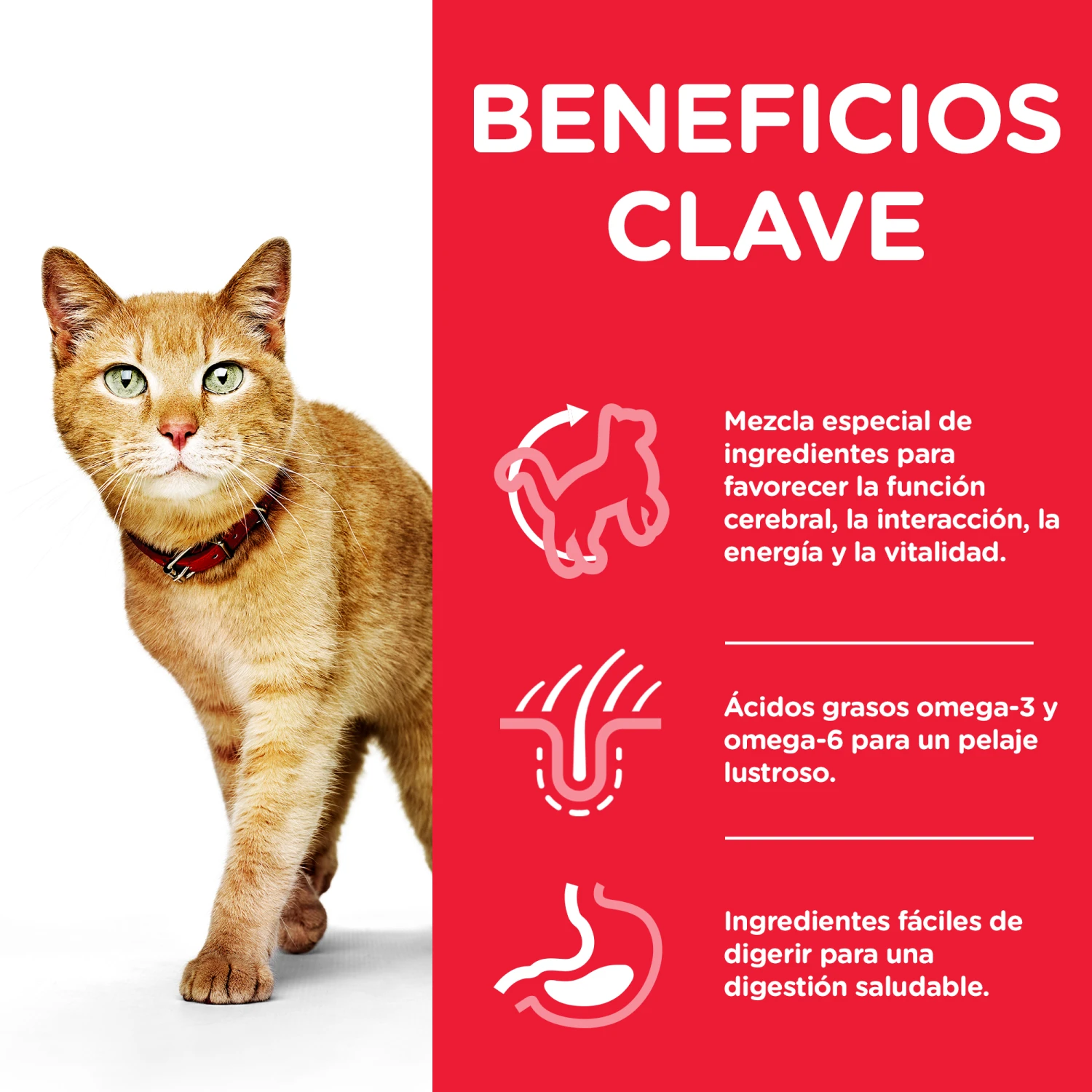Es un alimento especialmente diseñado para gatos mayores de 7 años, especializados para combatir el envejecimiento felino, sus ingredientes ayudan a promover la función cerebral, la energía y vitalidad, la salud renal y del tracto urinario, el aparato digestivo saludable y el pelo brillante.
