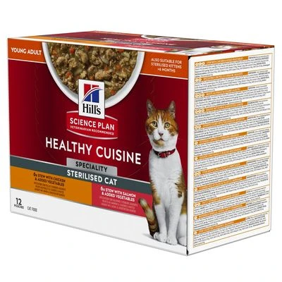 Hill’s Science Plan Adult Sterilised Healthy Cuisine con pollo y salmón es un alimento húmedo para gatos jóvenes esterilizados y castrados, que puede ayudar a mantener su peso ideal.