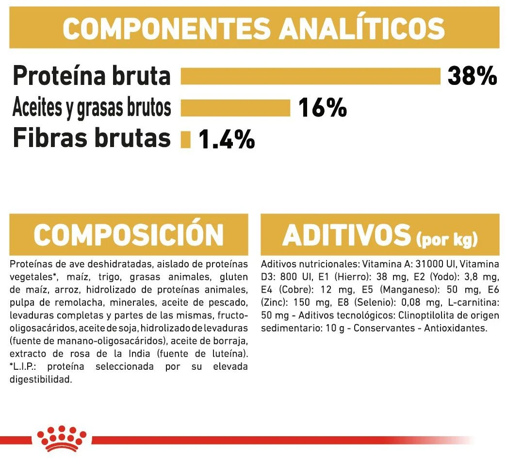 Harina de subproductos de pollo, maìz, proteína vegetal purificada (L.I.P.*), grasas animales, harina de gluten de maíz, hidrolizado de hígado, arroz, cebada, pulpa de remolacha, sales minerales, L-lisina, fibra vegetal, aceite de pescado, zeolita, aceite vegetal (con aceite de borraja), DL-metionina, fructo-oligosacáridos (FOS), oligoelementos, vitaminas, oligoelementos quelados, manano-oligosacáridos (MOS), taurina, huevo en polvo, L-carnitina, extracto de rosa de la India (rico en luteína