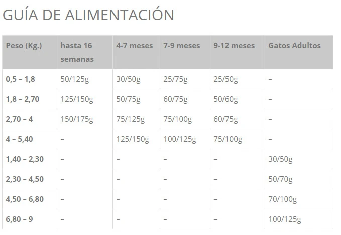 Proteínas 32% (mín), grasas 16%, fibra 3%, humedad 10%, calcio 1.6%, fósforo 1.1%, taurina 0.15%, zinc 120 mg/kg, selenio 0.4mg/kg, ácidos grasos omega 6 2.4%, ácidos grasos omega 3 0.3%, vitamina E 150 UI/kg.