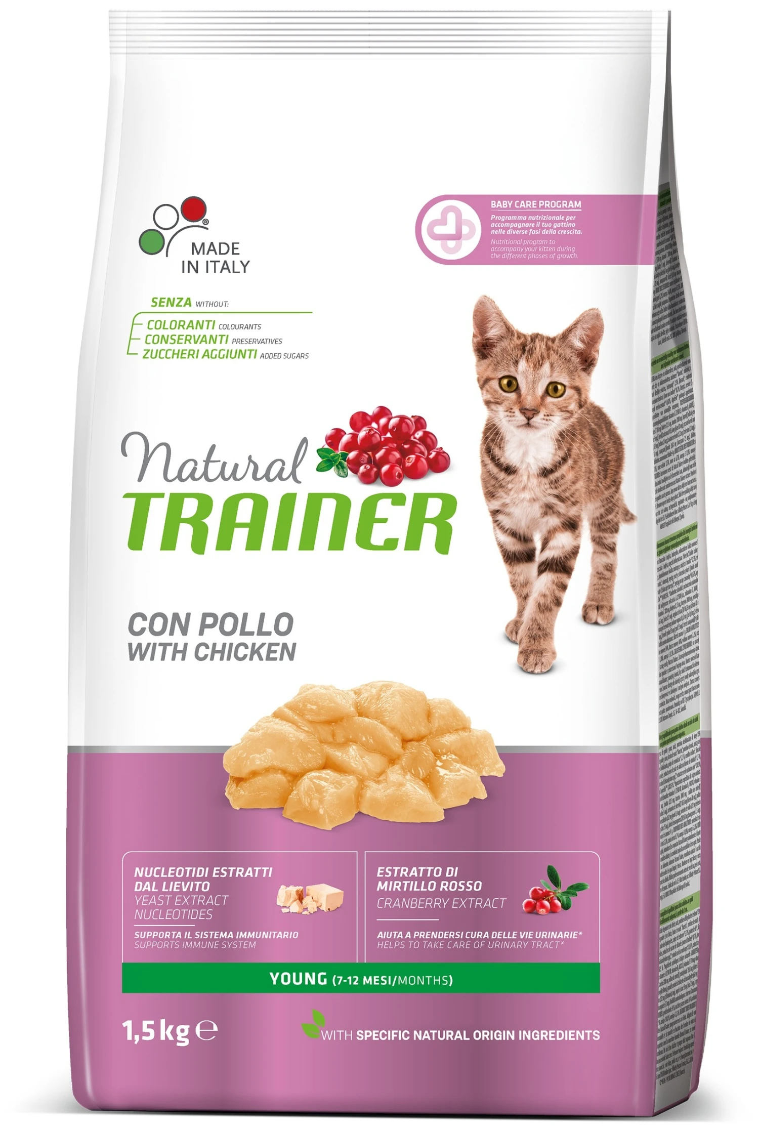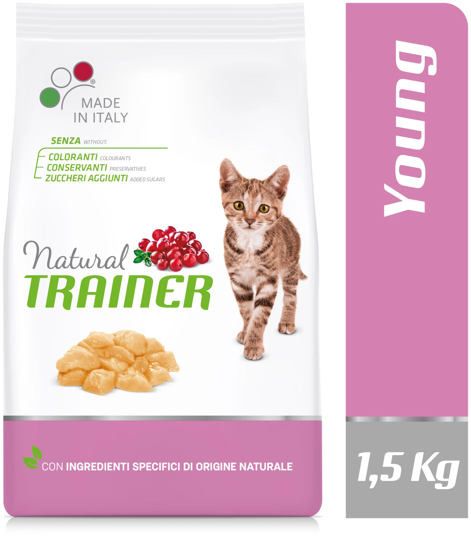Natural Trainer Young Cat, elaborado con pollo fresco e ingredientes funcionales como el arándano rojo o la menta poleo aportan los nutritentes necesarios para cuidar de la salud de tu gatoa partir de los siete meses.